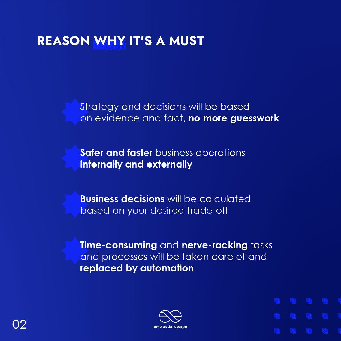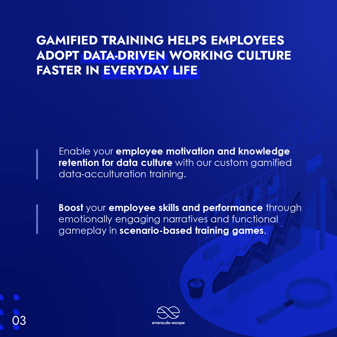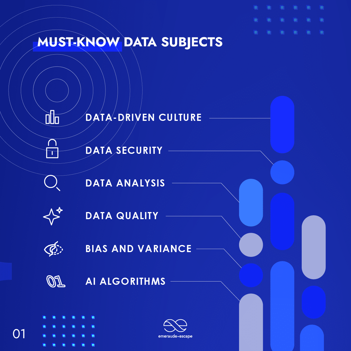 Emeraude Escape propose les formats de jeu les plus engageants pour la formation à la culture des données, à la gouvernance des données, à la qualité des données, à l’importance des données, à l’utilisation de l’IA pour les algorithmes, à la sécurité des données et aux biais et variances des données.