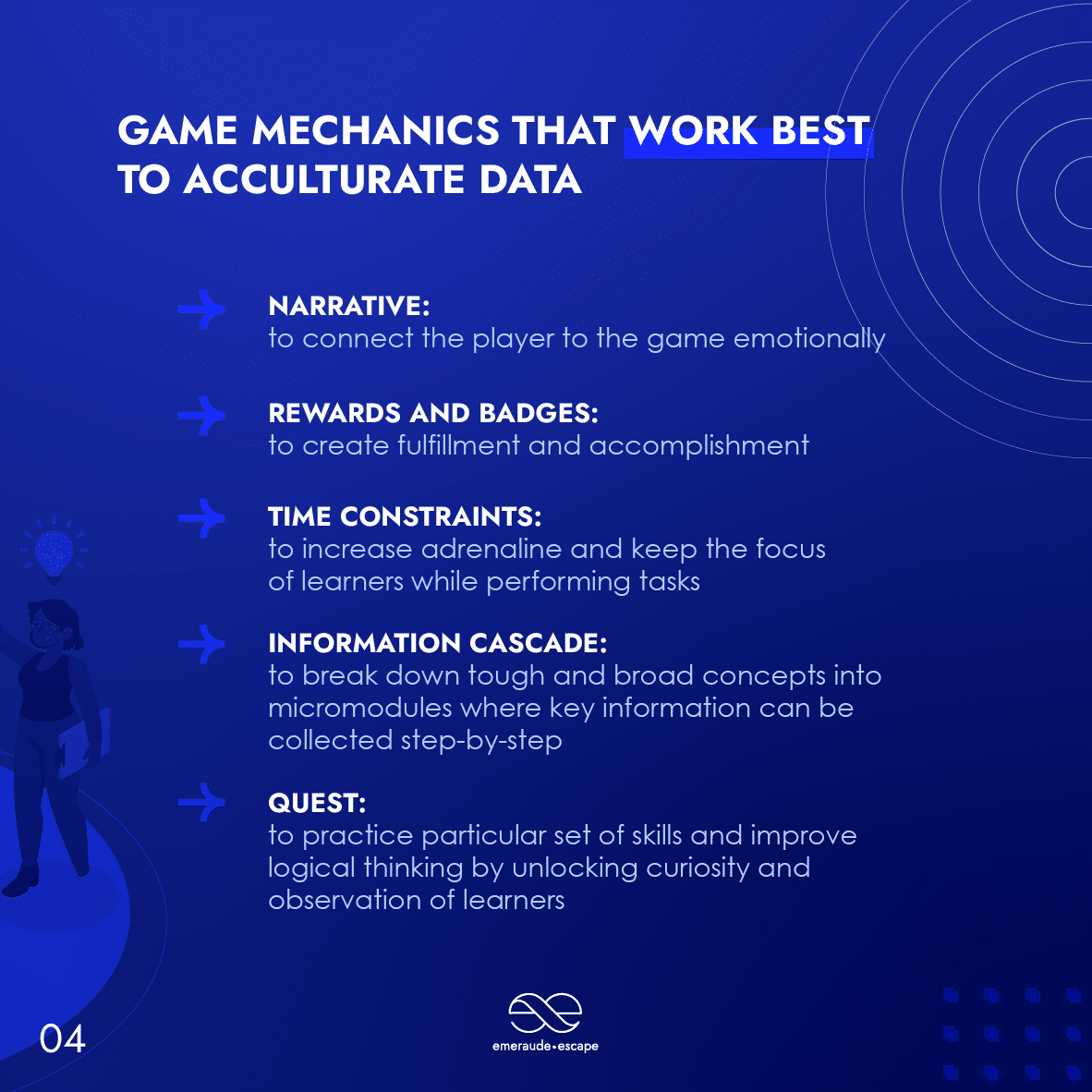 Lorsque la plupart des collaborateurs voient un ensemble de données sur une feuille excel ou un PowerPoint, ils décrochent et se désintéressent. Pour qu’ils restent constamment engagés, placez vos données dans des scénarios de jeu. Voici les éléments de jeu que nous proposons pour que vos jeux soient plus efficaces, efficients, engageants, durables et divertissants.